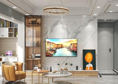 客廳比較簡潔明亮,背景墻采用大理石裝飾,原木系電視柜,搭配玻璃柜門,讓青春洋溢的空間,多了一絲時尚感。
