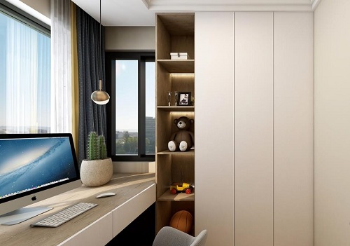 次臥是給孩子準(zhǔn)備的,定制衣柜,結(jié)合了書桌、書柜等功能,方便孩子日常學(xué)習(xí)使用。