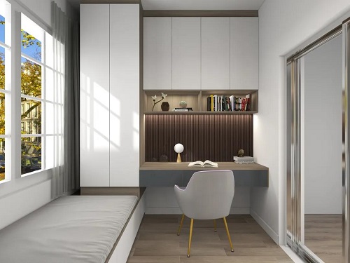 到頂的衣柜設計,內側設計成隱藏書柜,滿足業主睡前閱讀的需求,窗邊的梳妝臺,偶爾可以充當書桌,來滿足隨身辦公的需求。