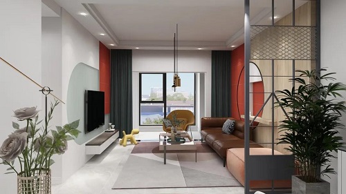 客廳空間不是很大,電視柜采用懸掛式,背景墻藍紅色搭配,層次感更加豐富。